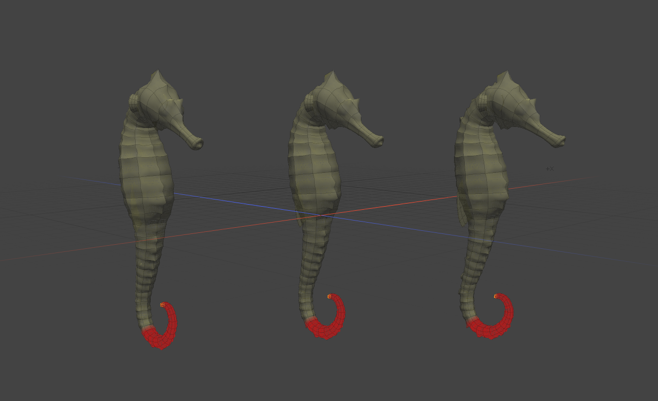 The heat method computes the geodesic distances from the tail of each seahorses.
